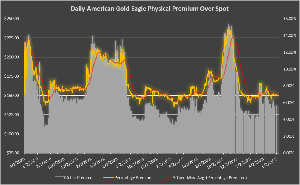 - UPDATE: 6/17/21 @ 12:00 NOON EST: This morning the physical gold premium jumped above 12% (while the spot price plunged below $1,800.00) as the recent low cost dealer, APMEX, no longer had large quantities of coins for sale. Now that APMEX has come back in with more than 10 coins available, the percentage premium has declined to 10.92%