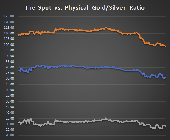 For graphs showing the physical gold & silver premiums as well as the current physical gold/silver ratios compared to spot, please go to my website: http://www.didthesystemcollapse.org