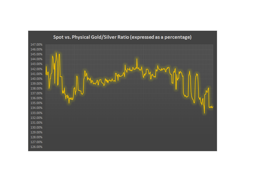 - Spot vs. Physical Gold/Silver Ratio Percentage: 134.31%