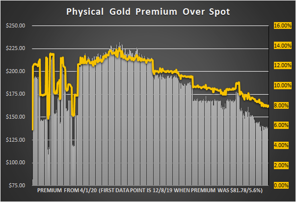 For graphs showing the physical gold & silver premiums as well as the current physical gold/silver ratios compared to spot, please go to my website: http://www.didthesystemcollapse.org