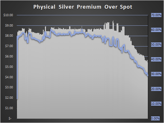 The physical silver premium hit a high on 4/21/20 at 60.64%.