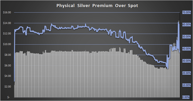 But then Bullion Exchanges started selling in quantity later in the day. And then Liberty Coin came in with lower prices which lowered the premium later in the day back into the high 30% range.
