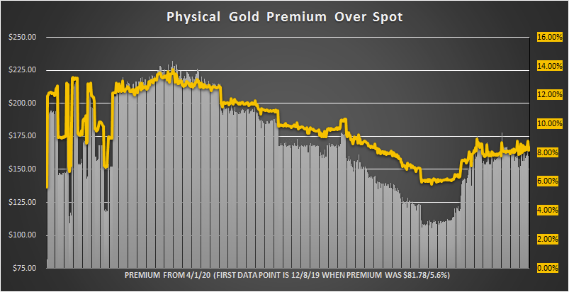 For graphs showing the physical gold & silver premiums as well as the current physical gold/silver ratios compared to spot, please go to my website: http://www.didthesystemcollapse.org