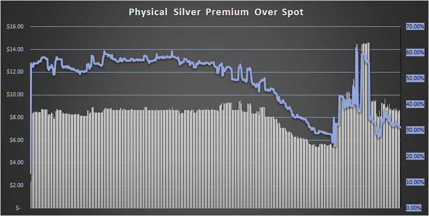 For graphs showing the physical gold & silver premiums as well as the current physical gold/silver ratios compared to spot, please go to my website: http://www.didthesystemcollapse.org