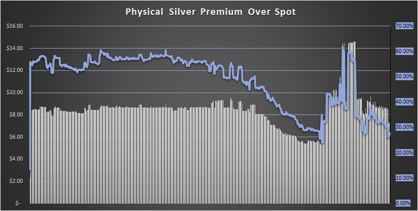 For graphs showing the physical gold & silver premiums as well as the current physical gold/silver ratios compared to spot, please go to my website: http://www.didthesystemcollapse.org