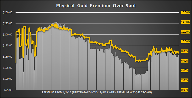 For graphs showing the physical gold & silver premiums as well as the current physical gold/silver ratios compared to spot, please go to my website: http://www.didthesystemcollapse.org