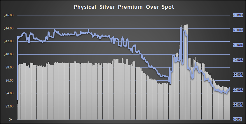 Despite the carnage in the spot gold market, physical gold premiums have remained steady at the high 7% – low 8% range for about the past month.
