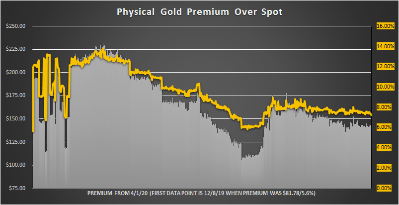 For graphs showing the physical gold & silver premiums as well as the current physical gold/silver ratios compared to spot, please go to my website: http://www.didthesystemcollapse.org