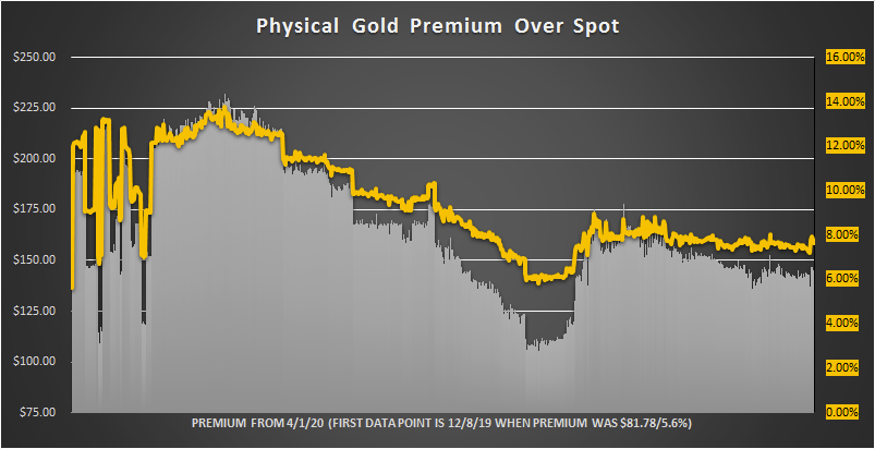 For graphs showing the physical gold & silver premiums as well as the current physical gold/silver ratios compared to spot, please go to my website: http://www.didthesystemcollapse.org