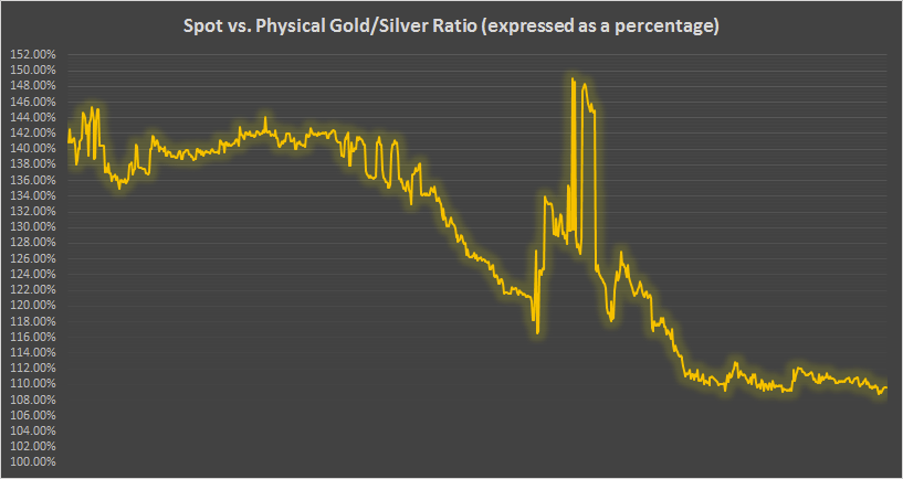For graphs showing the physical gold & silver premiums as well as the current physical gold/silver ratios compared to spot, please go to my website: http://www.didthesystemcollapse.org