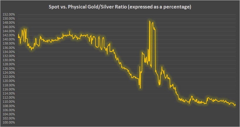 The above chart shows the percentage premium of the spot vs. physical gold/silver ratio.