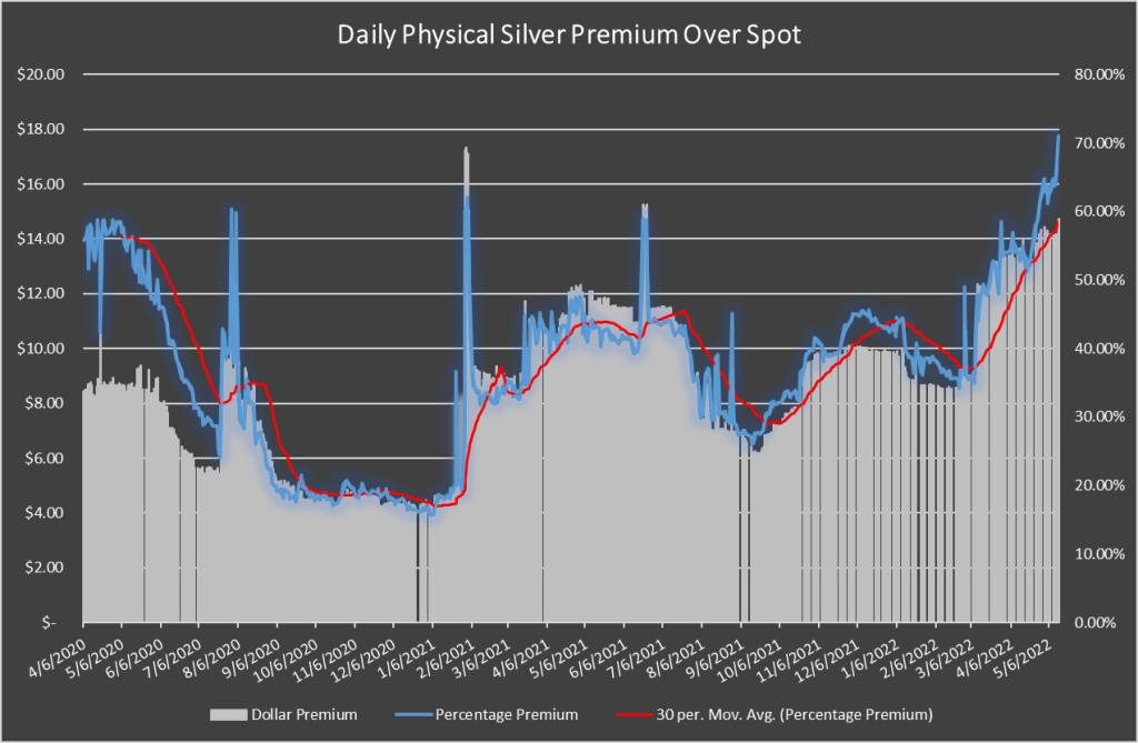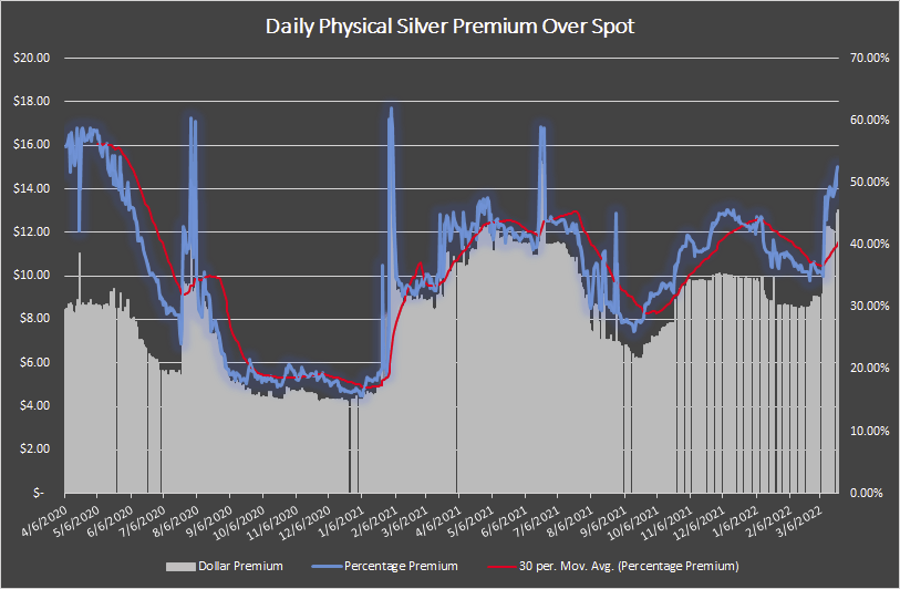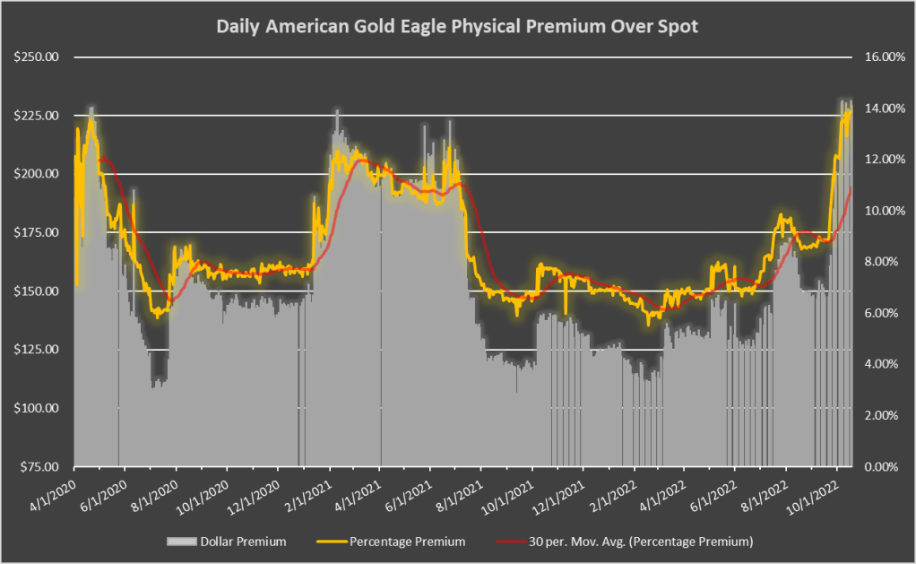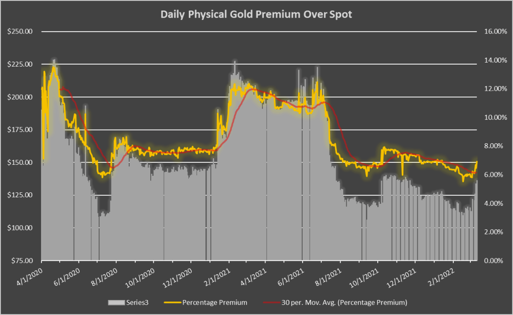 I just noticed that the physical gold premium and the spot price of gold are often inversely correlated. In other words, every time you would want to buy gold (when the spot price is cheaper), the premium appears to explode higher. So this throws a bit of cold water on the urge to make a physical purchase.