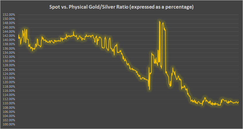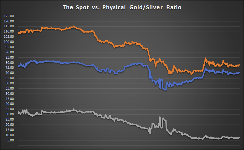 For graphs showing the physical gold & silver premiums as well as the current physical gold/silver ratios compared to spot, please go to my website: http://www.didthesystemcollapse.org