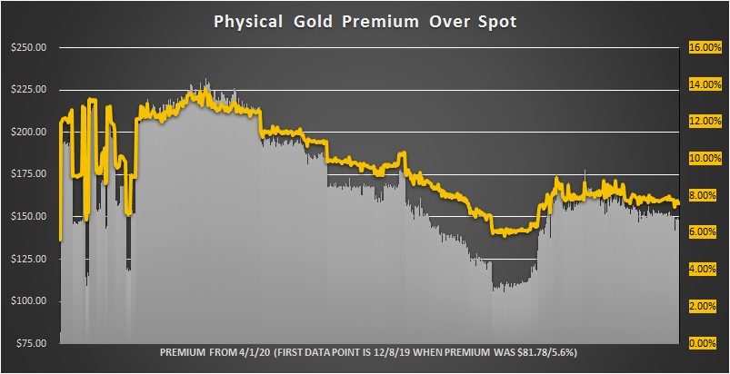 For graphs showing the physical gold & silver premiums as well as the current physical gold/silver ratios compared to spot, please go to my website: http://www.didthesystemcollapse.org
