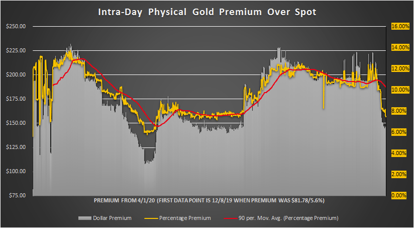 This is yet another sign that the physical gold price has weakened – a fact that jumps out at you when you look at the current Physical Gold Premium Over Spot.