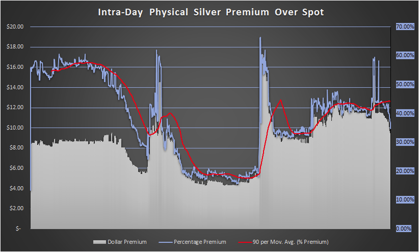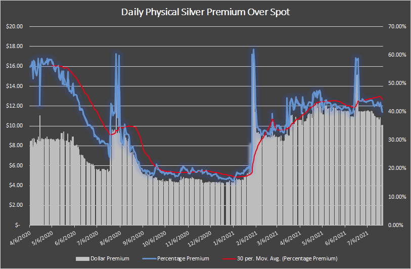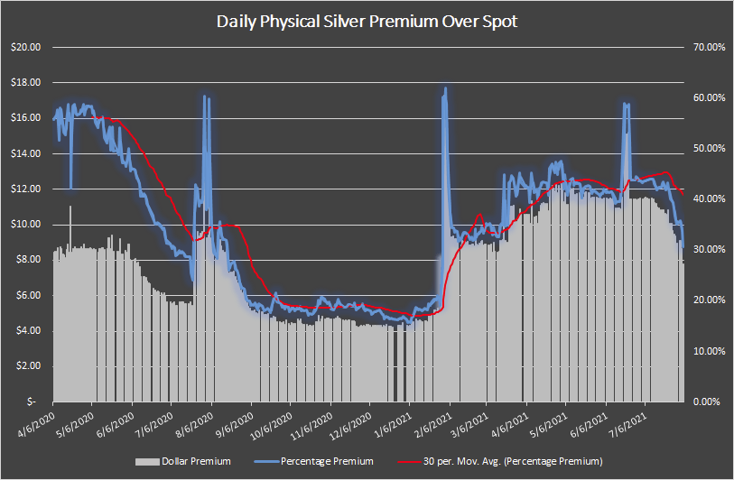UPDATE 7/27/21 @ 1:10 PM EST: The Physical Silver Dollar Premium has slipped below $10.00 for the first time since 3/22/21. The Physical Silver Percentage Premium has also dipped below 40%.